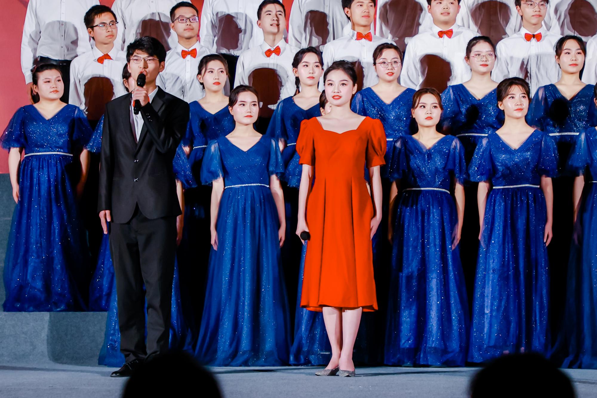 “希望之光”合唱团于第十一位出场,2020级光电信息科学与工程专业的张秉颜、2021级电子科学与技术专业的李奕扬同学伴随《我爱你中国》的钢琴音乐深情朗诵,全体成员精神饱满、台风稳健,用真挚细腻的情感表达了光电工程公司师生对党和祖国的无限热爱。男高音洪亮有力、男低音雄浑厚重、女高音婉转优美、女低音深沉稳健。“追寻我生命的那份纯真;心中抹不去的那一抹云彩;追寻那永远属于我们的那份无悔的忠贞……”,伴随着悠扬的钢琴伴奏旋律,“希望之光”合唱团用动人的歌声展现了共产党人上下求索,为共产主义事业终身奋斗的画卷,歌颂了共产党人前赴后继、不畏艰难,全心全意为人民服务的精神。恢弘大气的演唱搭配娓娓道来的演绎得到了台下评委和观众的一致肯定,随着最后的旋律结束,“希望之光”合唱团向现场观众鞠躬致谢,英国上市公司365助威团挥舞院旗,全体成员齐声高喊:“光电引领,未来可期!我们一直在追寻,我们永远跟党走!”观众们也纷纷挥舞手中的荧光棒,为合唱团的演唱鼓掌欢呼,将合唱比赛现场的情绪推向了高潮。