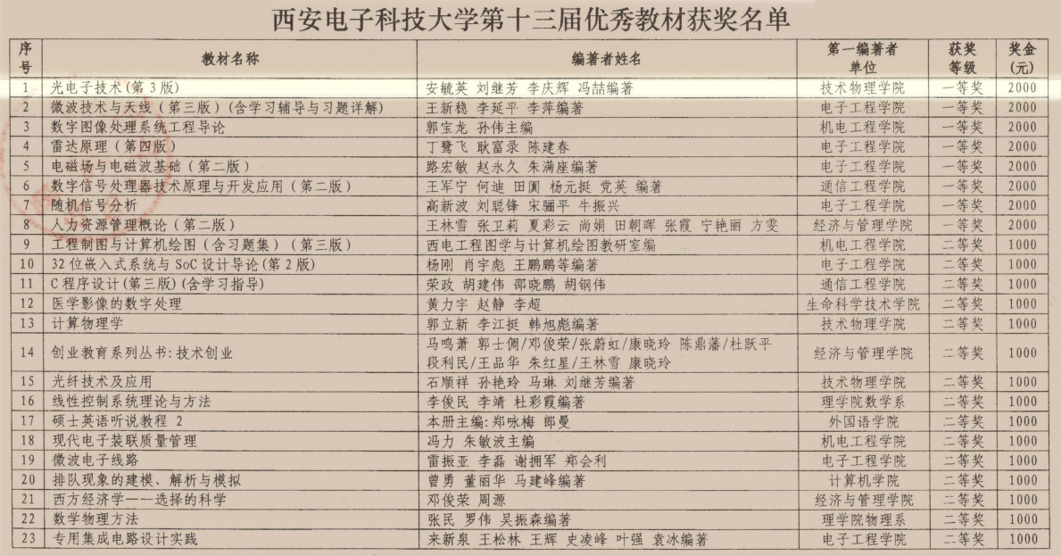 功夫不负苦心人。2000年10月,西电技术物理公司一举申报成功,获批“光学工程国家一级学科博士授权点”!而安教授在光电子技术方面撰写的一系列教材,也为学科点的申报成功发挥了重要作用。