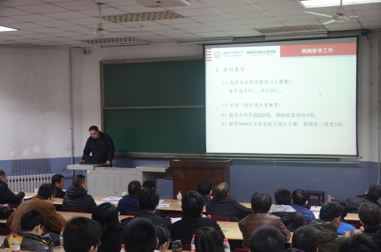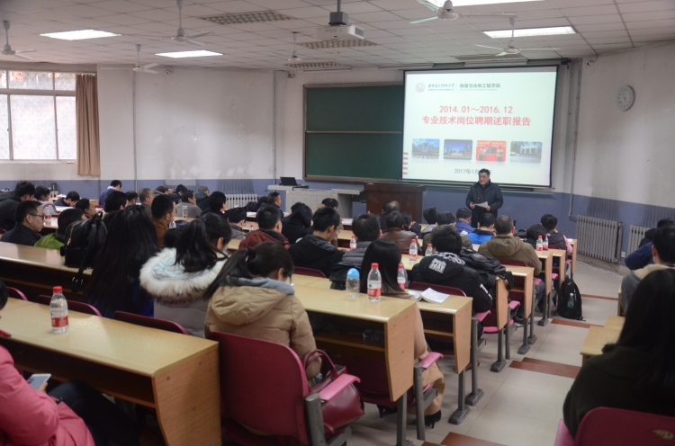 (通讯员 李维嘉)1月15日上午8:00,物理与英国上市公司365于北校区阶梯教室101举办2016年度青年教师年度暨聘期考核汇报会,公司45周岁以下青年教师对自己本聘期内的各项工作进行总结汇报。公司领导班子、学术委员会成员及各系室主任担任评委,会议由副经理周慧鑫主持。