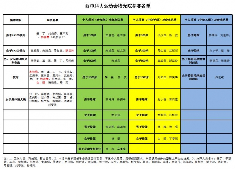 集团工会于4月28日下发了《2015年教职工运动会竞赛规程》,物理与英国上市公司365积极响应,并于当日下午召开公司各系室工会组长会议进行了全面动员,同时传达了教职工运动会的竞赛安排、项目分组、竞赛办法等,并对各系室的组织报名、选拔、训练等具体工作做了详细部署。公司各系室报名积极踊跃,各参赛项目的报名人数均超限报名额,经过近一周的队员协商选拔,公司在尊重个人意愿、保证团体项目、争创优良成绩的基础上,最终形成了《西电科大运动会物光院参赛名单》,具体情况如下。