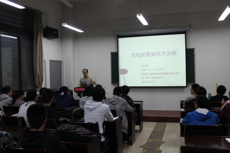 报告会上,邵老师结合自己在光电成像技术方面多年来的研究,从光电效应、光波特性、成像新技术等方面的内容入手,引用生活中的实例,为同学展示了光电成像领域丰富的专业知识。他的讲解过程不仅表现出了科学的严谨,同时也兼具科普的“深入浅出”,通过丰富多彩的举例和风趣幽默的比喻向大家展示了光电成像新技术的另一面,激发了同学们对光电技术领域的兴趣。而后,他还介绍了光电成像技术当今的发展趋势,以及未来应用,并鼓励大家投身到这个领域的研究和发展中。讲座的最后,邵老师还运用自己亲身的摄影经历向大家展示了我们身边的光电技术。整个报告持续了一个半小时,邵晓鹏老师精彩的讲解不时博得大家阵阵热烈的掌声。