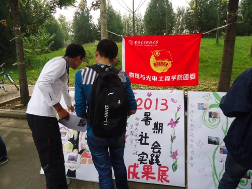 此次参加成果展的实践队伍主要有“东周梦翔”、“光电漂流”及“星火燎‘袁’”等暑期社会实践队。实践队利用活动照片、文字说明以及现场讲解的方式,向同学们展示了物理与光电工程社会实践工作的积极成果。工作人员一方面向新生发放传单,另一方面对新生提出的问题进行详细的解说,整个活动现场气氛热烈。