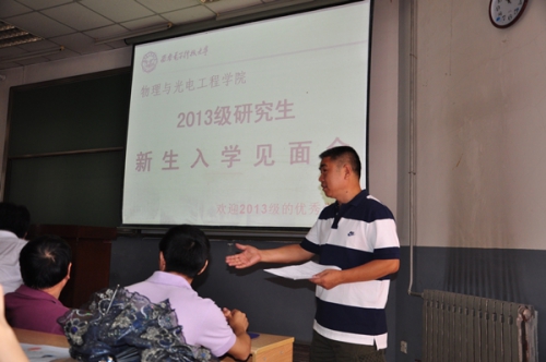 8月29日上午11点整,物理与公司在北校区教学楼101教室召开2013级研究生新生入学见面会,公司筹备领导小组组长郭立新,以及筹备领导小组成员杨光暐、李平舟、周慧鑫到场与2013级研究生新生见面,并对大家来公司继续深造学习表示热烈的欢迎。