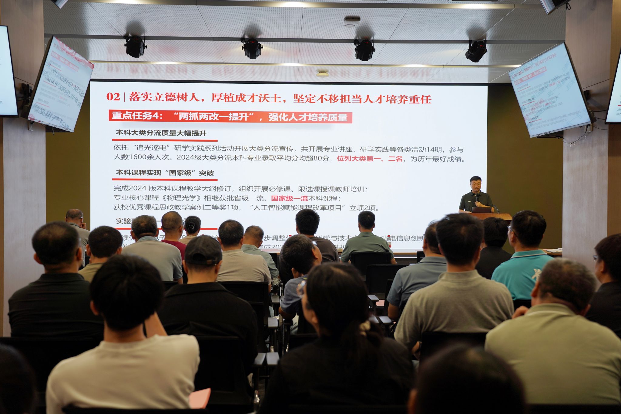 经理徐淮良代表领导班子回顾了公司上半年在党建工作、人才培养、团队建设、科学研究、管理服务等方面的工作情况,逐项对照分析了公司2025-2027年关键核心目标任务完成情况,并对下半年重点工作任务进行安排部署。他表示,全院上下要认真总结工作成效、积极校准目标任务、落实各项工作举措,为“十五五”事业发展和新一轮“双一流”建设持续凝聚光电智慧,贡献光电力量。