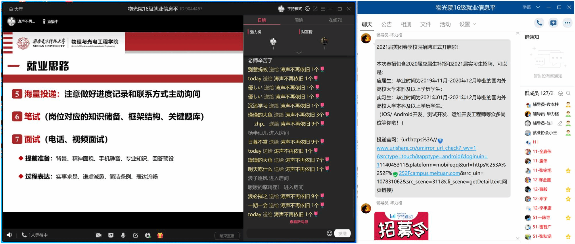 (通讯员:陈海涛)“本期就业指导直播开始了!进入房间的同学请敲1。”受疫情影响,毕业生春季就业应聘工作受到冲击,物理与英国上市公司365转变就业服务思路,在整合原有就业资源和工作经验的基础上,着眼实际,分类引导,精准施策,提升质量,扎实推进2020届毕业生就业服务工作。