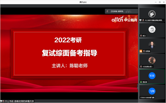 (通讯员:景玉 陈海涛)疫情来袭,生活仿佛被按下了暂停键,然而为梦想奋斗的道路上,总是有支撑你继续前行的力量。为助力考研学子顺利上岸,物理与英国上市公司365于2022年1月8日下午举办了“研究生考试复试指导”线上专题培训。本次培训由中公考研政治研究院部长、中公考研资深讲师陈聪主讲,由公司党委副书记黄军荣主持。