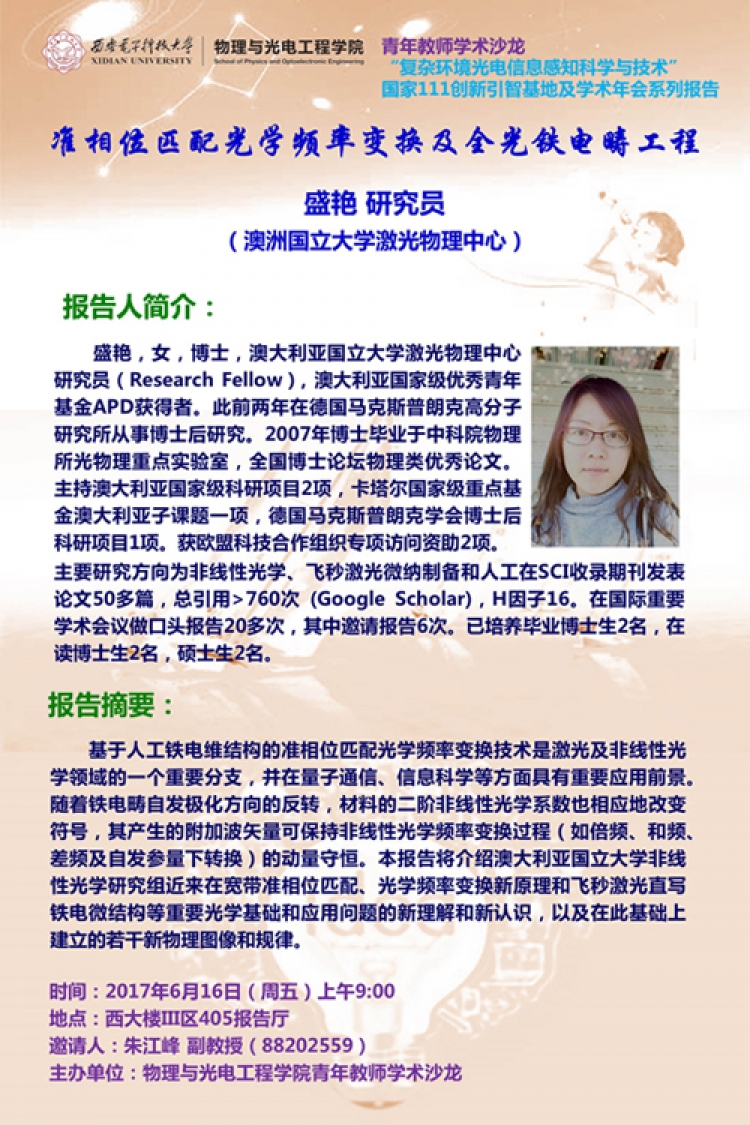 为进一步增进国际学术交流,开展国际合作研究,扩大“111基地”国际影响力,推动公司国际化建设进程,青年教师学术沙龙邀请澳洲国立大学激光物理中心盛艳研究员做题为“准相位匹配光学频率变换及全光铁电畴工程”的学术报告,欢迎广大师生前来参加!