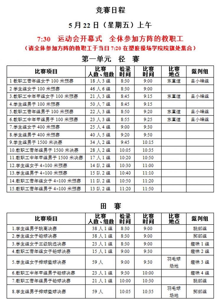 “2015年教职工运动会”将于本周五、六两日(5月22、23日)在新校区塑胶操场举行,现将《赛程安排》公布如下,请各系室工会组长通知各位选手(参照《西电科大运动会物光院参赛名单》,查看网址:http://stp.xidian.edu.cn/view-1194.html)提前做好参赛准备,着公司统一运动服按时参赛,同时,也鼓励未参赛教职工前来观看,为公司加油打气!请相互转告。