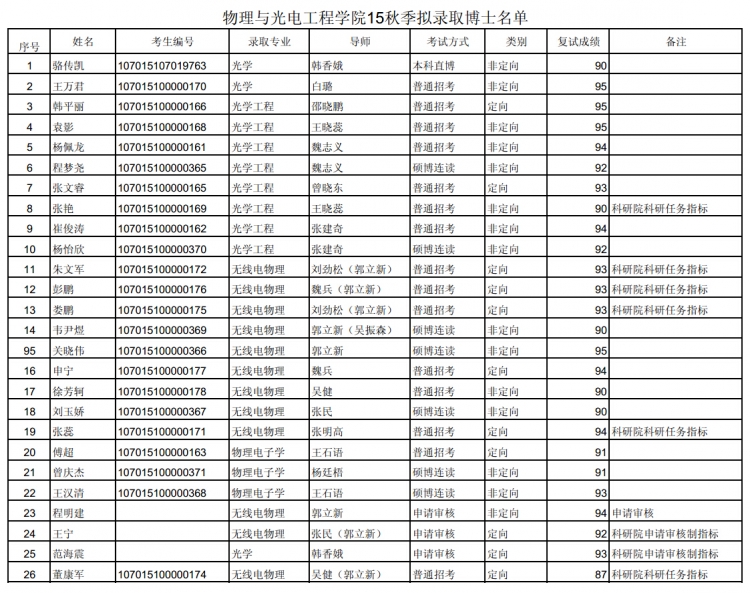 物光院秋季博士拟录取名单(公示)