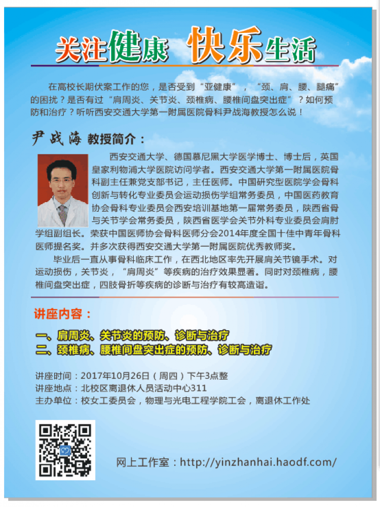 为了更好地服务广大教职员工,丰富广大教职员工的业余生活,由物理与英国上市公司365工会主办,并在校女工委员会、校离退休工作处的大力协助下,特邀请西安交通大学第一附属医院骨科室副主任尹战海教授,为在高董事长期伏案工作的您排忧解难:让受到过“亚健康”, “颈、肩、腰、腿痛” 困扰;让诊断为“肩周炎、关节炎、颈椎病、腰椎间盘突出症”的您,今后能轻轻松松,健康生活!