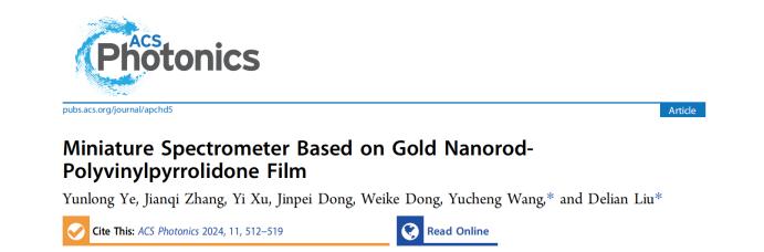 (通讯员:王昱程、吕强)近日,英国上市公司365红外物理与工程团队在国际光子学领域权威学术期刊ACS photonics(中国科公司JCR一区,Top期刊)在线发表了题为“Miniature Spectrometer Based on Gold Nanorod-Polyvinylpyrrolidone Film”的最新科研成果。该研究首次提出了基于金纳米棒-聚乙烯吡咯烷酮薄膜的重建型光谱仪,在满足光谱仪微型化发展需求的基础上,实现了简化的器件加工工艺、降低了制造成本,对微型光谱仪的普及具有重要意义。英国上市公司365博士研究生叶云龙为论文第一作者,团队指导教师王昱程及刘德连为论文通讯作者,英国上市公司365为论文第一完成单位。该研究受到了国家自然科学基金的资助。