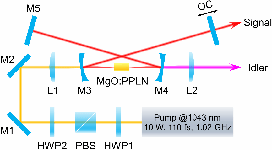 重复频率高达GHz的飞秒激光在光学频率梳以及非线性显微成像等领域具有重要的应用。相比于GHz锁模激光器而言,GHz飞秒光参量振荡器(OPO)同时具有高重复频率以及宽波长调谐特性,因而对于实际应用至关重要。GHz飞秒OPO一般采用常规的MHz重复频率的飞秒激光器作为泵浦源。然而,该方法具有较大的往返损耗,能量转换效率和输出功率较低,且不能同时获得GHz重复频率的信号光和闲频光。