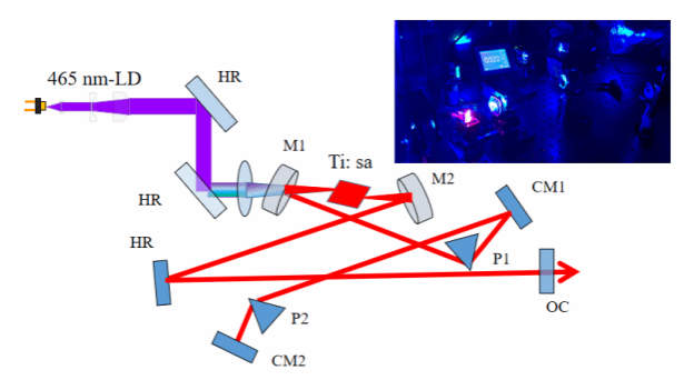 高功率蓝光激光二极管直接泵浦的钛宝石飞秒激光器,可数倍降低钛宝石飞秒激光器的成本,不仅可以提高激光器的稳定性和集成度,还能有效改善系统的噪声特性。从产品的市场化应用潜力来看,应用本技术产生的克尔透锁模飞秒激光器可提供数百毫瓦、脉冲宽度小于20 fs的飞秒激光输出,相比较532nm 固体激光器泵浦的钛宝石飞秒激光器更具有性价比,同时具有更紧凑的结构,有利于钛宝石激光放大系统的进一步集成。在光学频率梳、THz波产生等科研领域、生物显微成像等医疗领域以及飞秒激光精密微纳加工等工业领域具有广泛的应用,具有重要的科学意义和应用价值。
