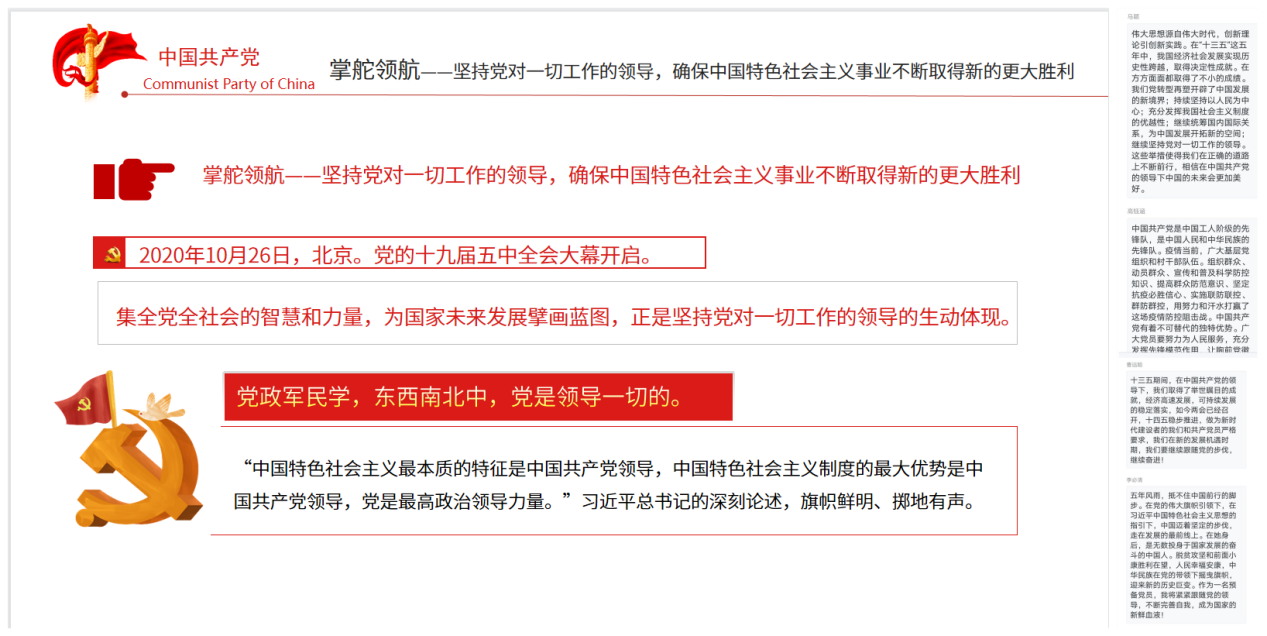 党小组员工党员们纷纷表示,通过这次的线上专题学习,更加坚定了理想信念,第一个百年奋斗目标实现胜利,第二个百年奋斗征程即将开启,站在历史交汇点上,展望“十四五”光明前景,瞻望2035年远景目标,在伟大旗帜指引下,我们豪情满怀。